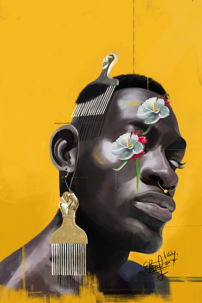 In another painting for @Osengwa, he paints the image of a man with both an afro-pick around his ear and an afro-pick in his hair.