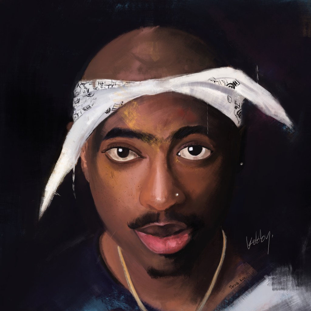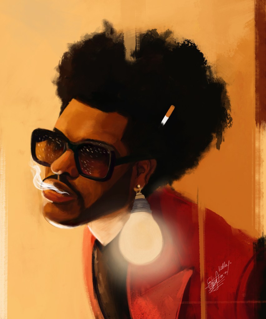Two of BLACKFISTS’ favorite digital paintings of Blankson’s are The Weeknd with a cigarette on his ear, smoke coming out of his mouth, and a lightbulb earring. Another is of 2Pac with a white bandana donned around his forehead.