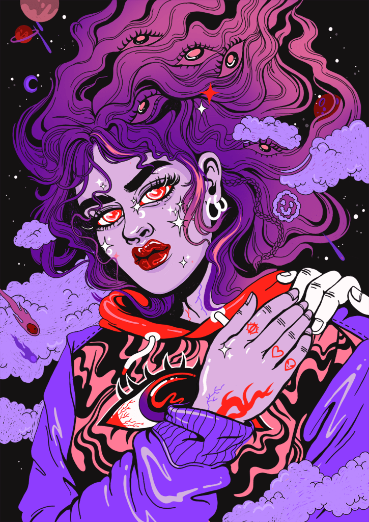 Although her pieces are quite together, they highlight the torn nature that we all have within, struggling with emotionality, connection, spirituality, and even the existence (or lack-there-of) of aliens. Featuring women independent of objectification, the viewer is presented with feminism and female empowerment in each work.