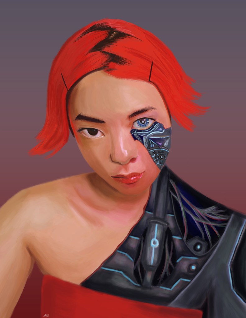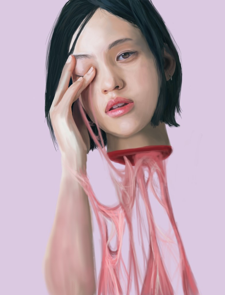 I think my interest in film is shown through my sketchbook mostly — I remember being sixteen and printing/cutting out screencaps from movies like Paris, Texas and My Own Private Idaho just to journal and draw on top of them. However, when I make digital paintings, I usually want to emphasize the beauty of Asian women since they’re mostly portrait style. My paintings are inspired by a lot of surrealism. It’s funny because the way I taught myself to draw was to take on this hyperrealistic style, which got boring after realizing how much pressure that is to make things perfect. That’s why I like to throw in… spins wheel… half a cyborg face or weird body horror. I’m really into horror movies lately. Throwing in touches like that also push me towards changing my art style because I’m definitely a perfectionist when it comes to illustrating human anatomy.