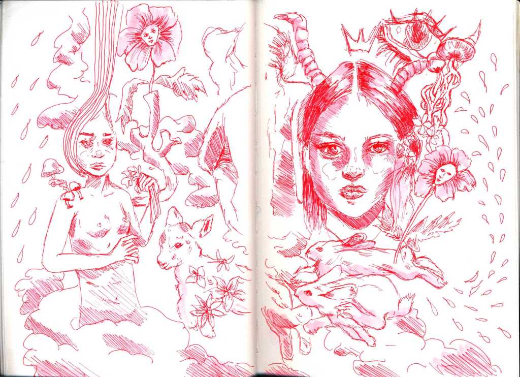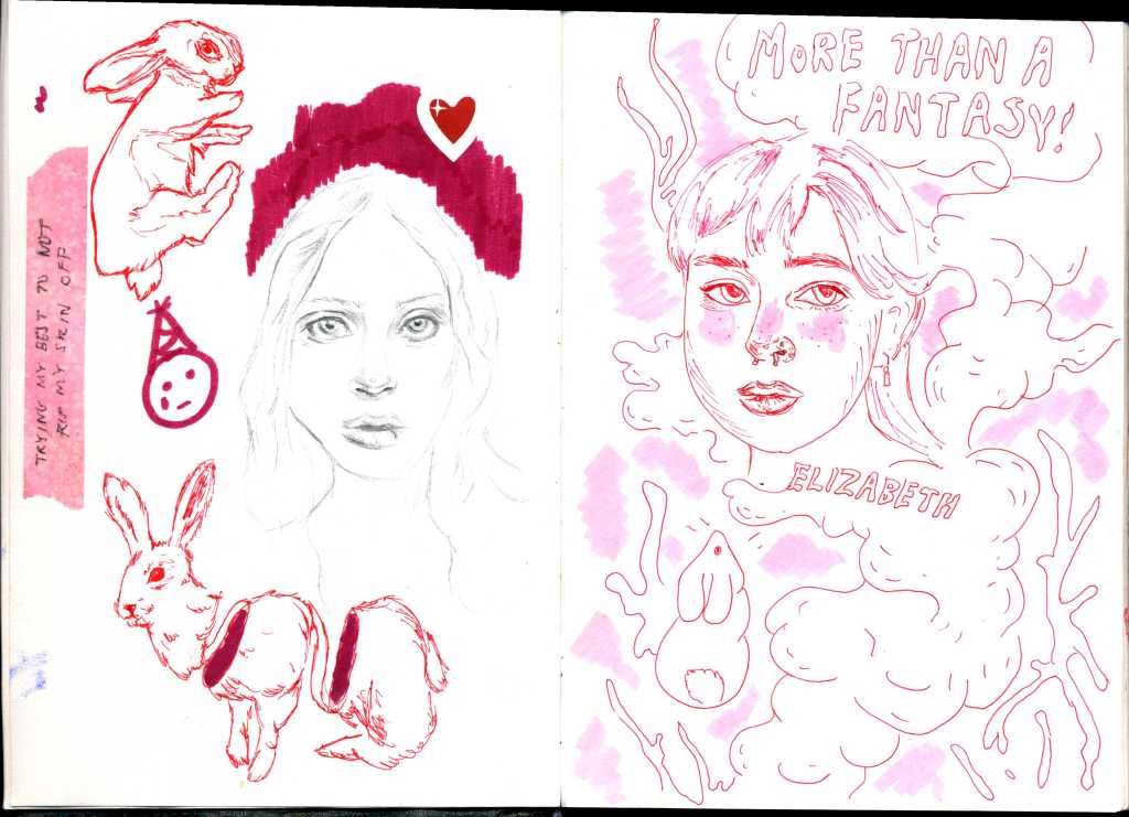 That’s just a little doodle that I did a while ago that I decided to use for my website. Then I kept drawing bunnies, like constantly, after that! It’s in three pieces for the same reason I incorporate body horror in a lot of my drawings and paintings — I feel like cutting things apart and allowing gore to look beautiful (in an artistic way) makes things more raw.